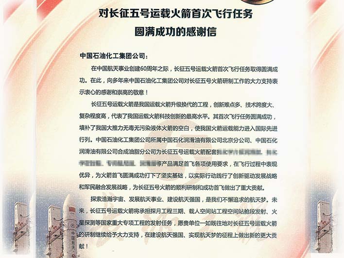 10/03 - 长征五号运载火箭型号办公室致谢中国石化长城润滑油