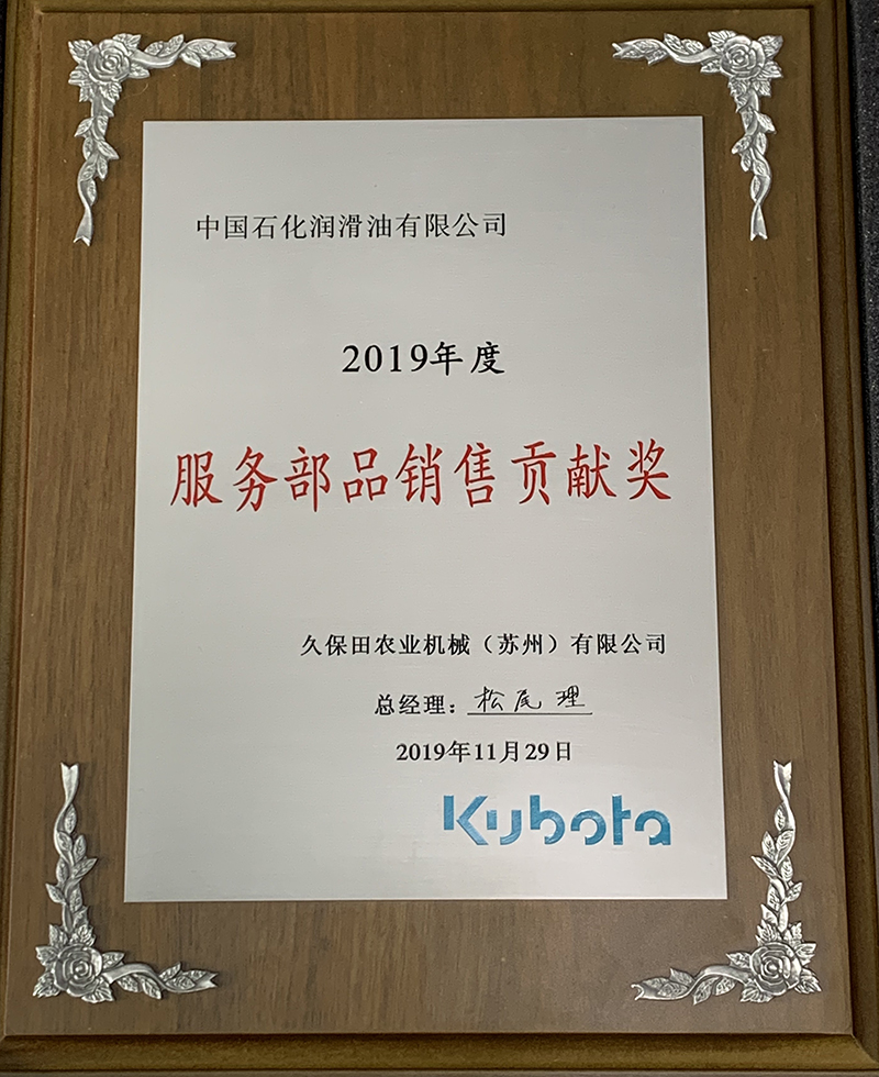 中国石化长城润滑油荣获久保田2019年度服务部品销售贡献奖