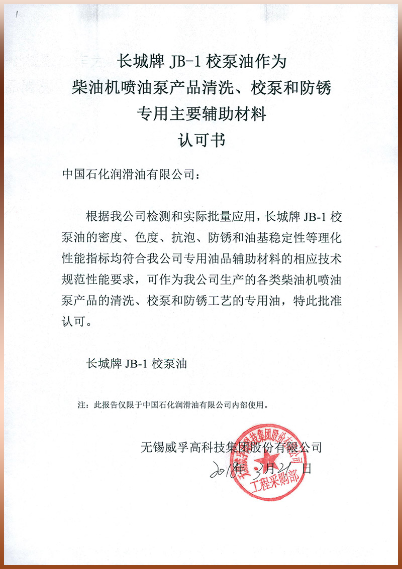 【校泵油】无锡威孚JB-1校泵油认可书