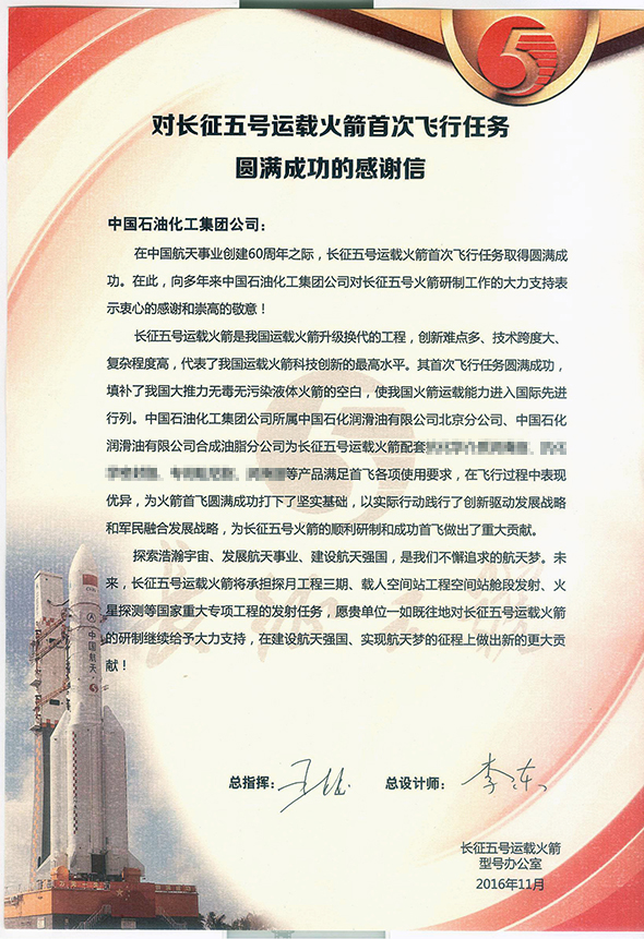 早在2016年11月,在“长征五号”首飞成功后,“长征五号”火箭型号办公室向长城润滑油发来了“长征五号运载火箭首次飞行任务圆满成功的感谢信”,在致谢中国石化大力支持的同时,肯定中国石化润滑油有限公司“为火箭首飞圆满成功打下了坚实的基础,以实际行动践行了创新发展驱动战略和军民融合发展战略,为长征五号的顺利研制和成功首飞作出了重大贡献。”