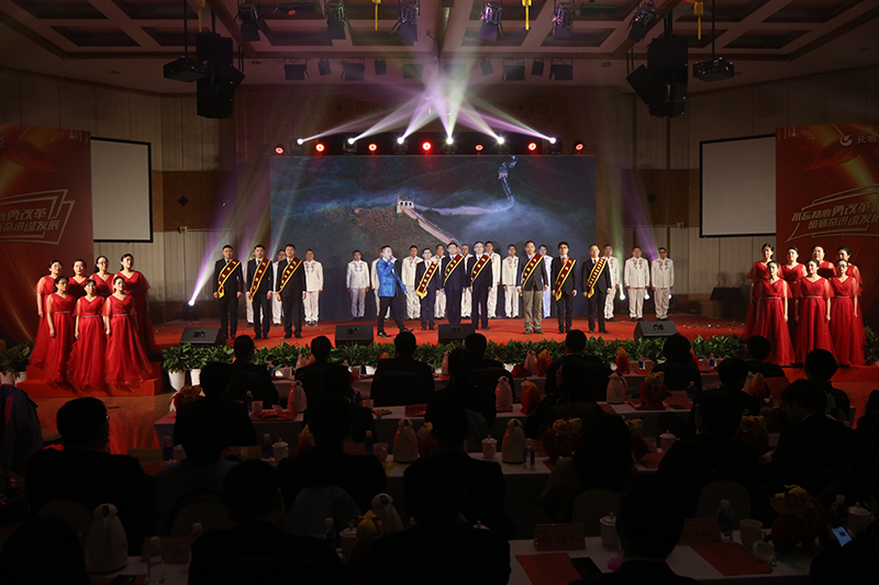 文明单位代表、先进集体代表、先进个人代表上台接受颁奖。先进代表在台上承诺:我承诺,敬业爱岗、担当作为,弘扬石油石化优良传统,作改革发展的排头兵!