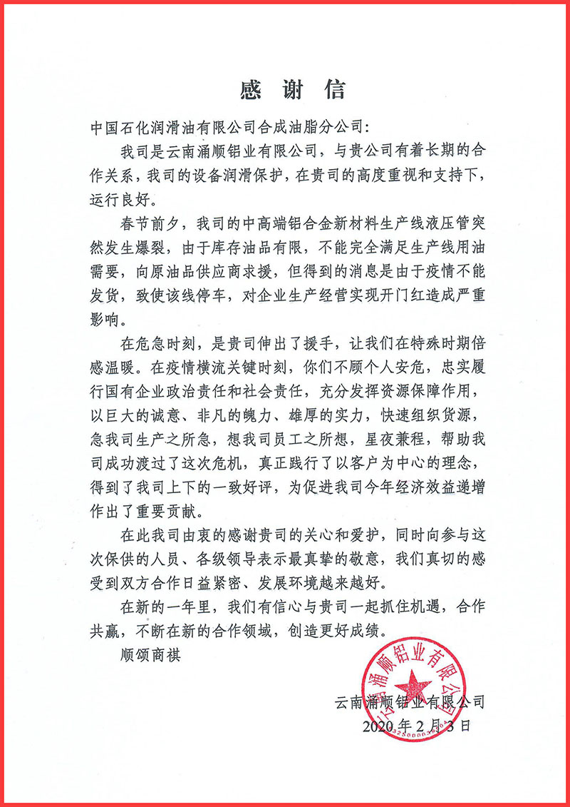 感谢信中这样写到,多年来,云南涌顺铝业有限公司设备润滑,得到中国石化润滑油有限公司合成油脂分公司的高度重视和充分优质保障。特别是在春节前夕,中高端铝合金新材料生产线液压管突然发生爆裂,原油品供应商由于疫情不能发货,致使该线停车的危情时刻,是中国石化长城润滑油以客户为中心,忠实履行央企政治责任和社会责任,主动伸出援手,充分发挥资源保障作用,以巨大的诚意、非凡的魄力、雄厚的实力,快速组织货源,急我司生产之所急,想我司员工之所想,星夜兼程,帮助我司成功渡过了这次危机,让我们在特殊时期倍感温暖,更得到我司上下的一致好评,为促进我司今年经济效益递增作出了重要贡献。
