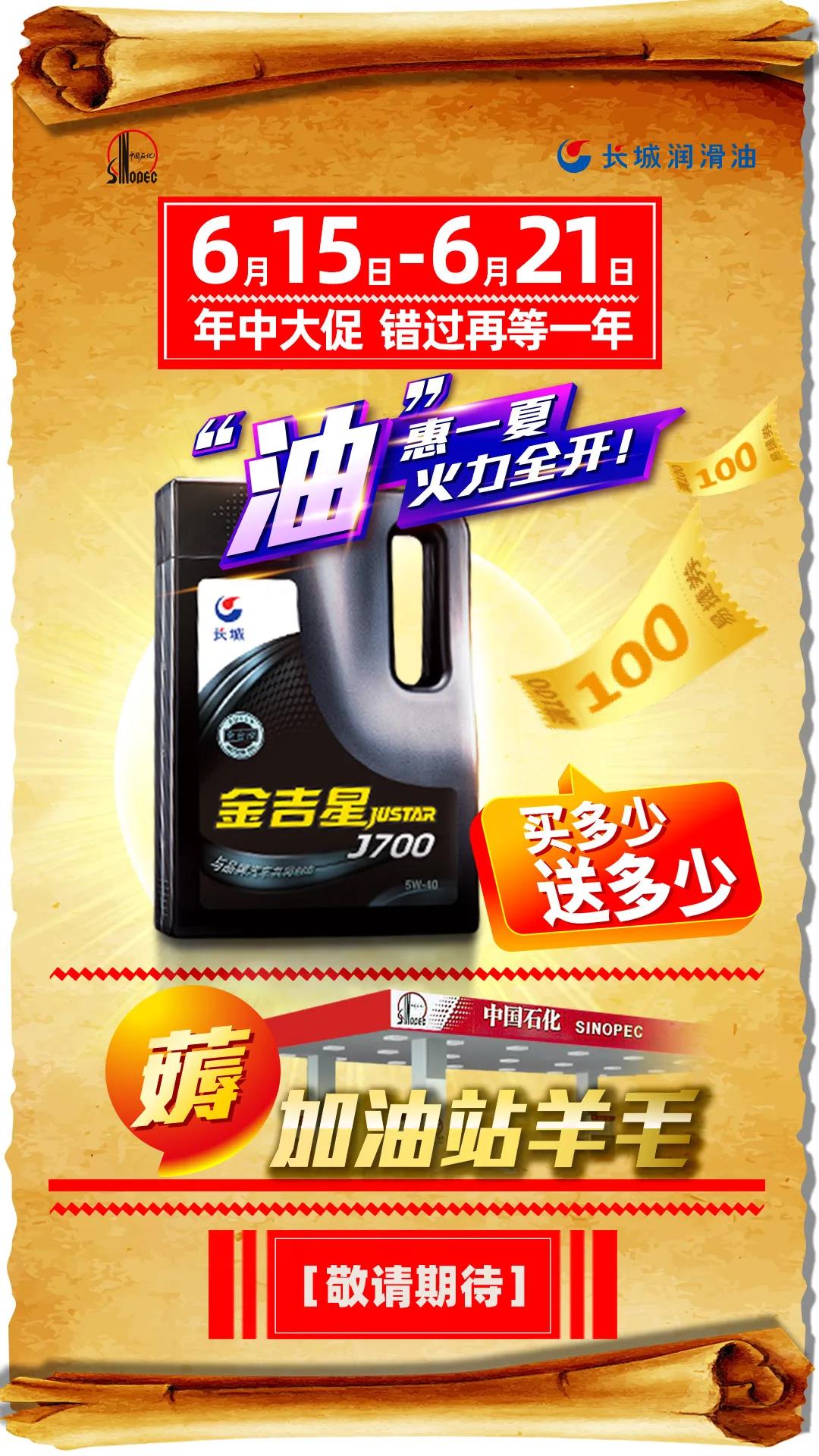 6月15日-21日,长城润滑油携手全国各地区石油分公司重磅推出“油惠一夏,火力全开”活动。只需通过所在地中石化加油APP进入到活动页面,购买长城金吉星机油选择附近中石化加油站提货,即可获赠大量礼金。礼金形式多样,包含易捷代金券、汽油代金券、免费换油、微信红包等。