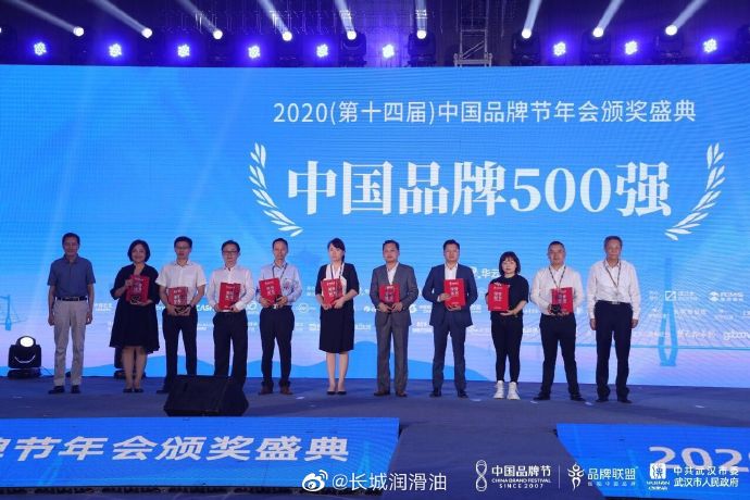 8月8日,在武汉举办的2020(第十四届)中国品牌节年会上,中国石化长城润滑油荣获“2020中国品牌榜500强”、“抗疫致敬品牌企业”两项荣誉。其中“抗疫致敬品牌企业”是本次品牌节年会上特别设立,对疫情期间做出突出表现的优秀品牌进行表彰。