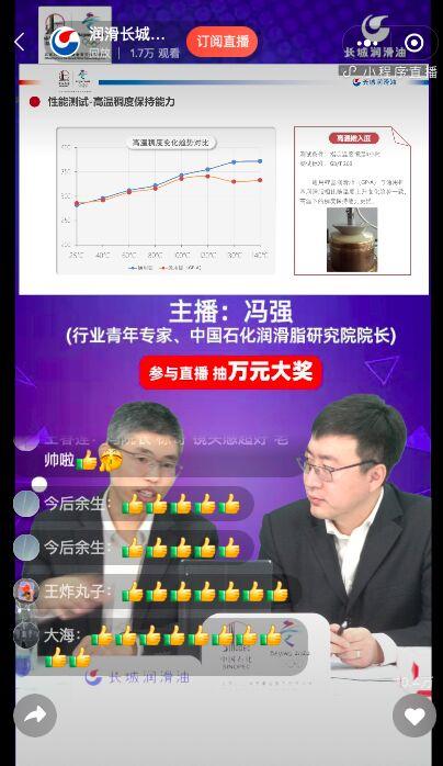 直播过程中,中国石化第一届青年科技精英赛优胜者、中国石化润滑油润滑脂研究院院长、青年润滑脂专家冯强讲述了“锂基脂”七十年来的前世与今生。从资源可持续利用到抗水性、抗氧化性能的改善和提升到新型通用锂基脂(GP-A)技术的绿色环保理念,无一不契合着新时代中国的高科技高质量发展的主题。李栋的随机铺排、引申,冯强的智慧、幽默,把原本抽象枯燥的润滑脂讲出了人间烟火气息,一个个形象的比拟、一次次生动的举例,让观众们听得身临其境、欲罢不能。原本开场哄哄着抽奖的喧闹一下子变成了向主播不断发问、探讨和满屏的点赞。