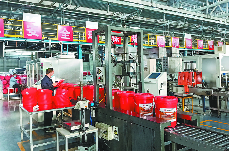 图为5月17日,一条生产线对专用发动机油进行灌装。
