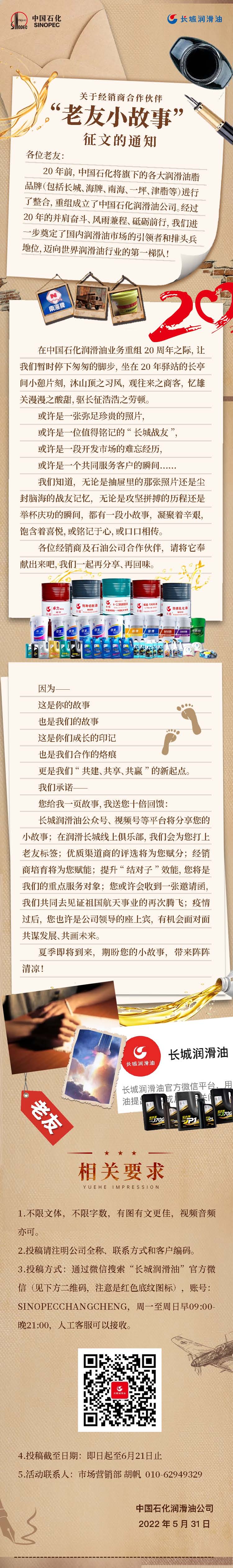 2022年5月29日是中国石化润滑油专业公司成立二十周年,由此,中国石化润滑油有限公司面向广大经销商合作伙伴们发起了“老友小故事”征文活动。