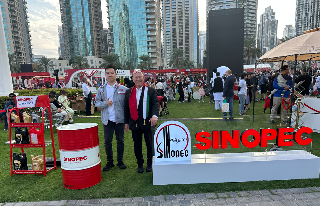 中国石化润滑油中东非洲代表处派遣员工,提供若干油品、货架、产品折页等宣传物料参与巡游活动,并向感兴趣的客人介绍SINOPEC润滑油产品。