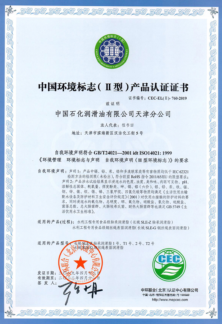 【润滑脂】中国石化润滑油天津分公司的水利工程专用食品级轴承润滑脂、水利工程专用食品级钢丝绳表面润滑脂两款产品,通过了中国环境标志(Ⅱ型)产品认证