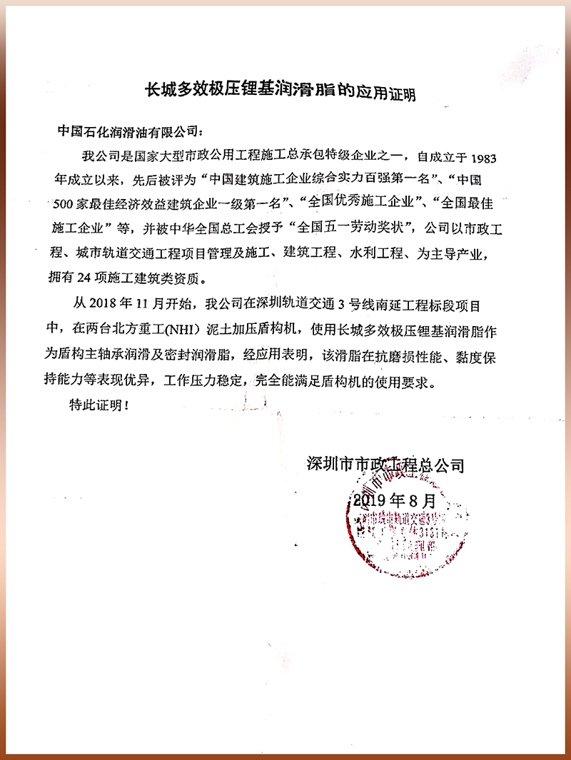 【润滑脂】长城润滑脂获深圳市政工程总公司认证