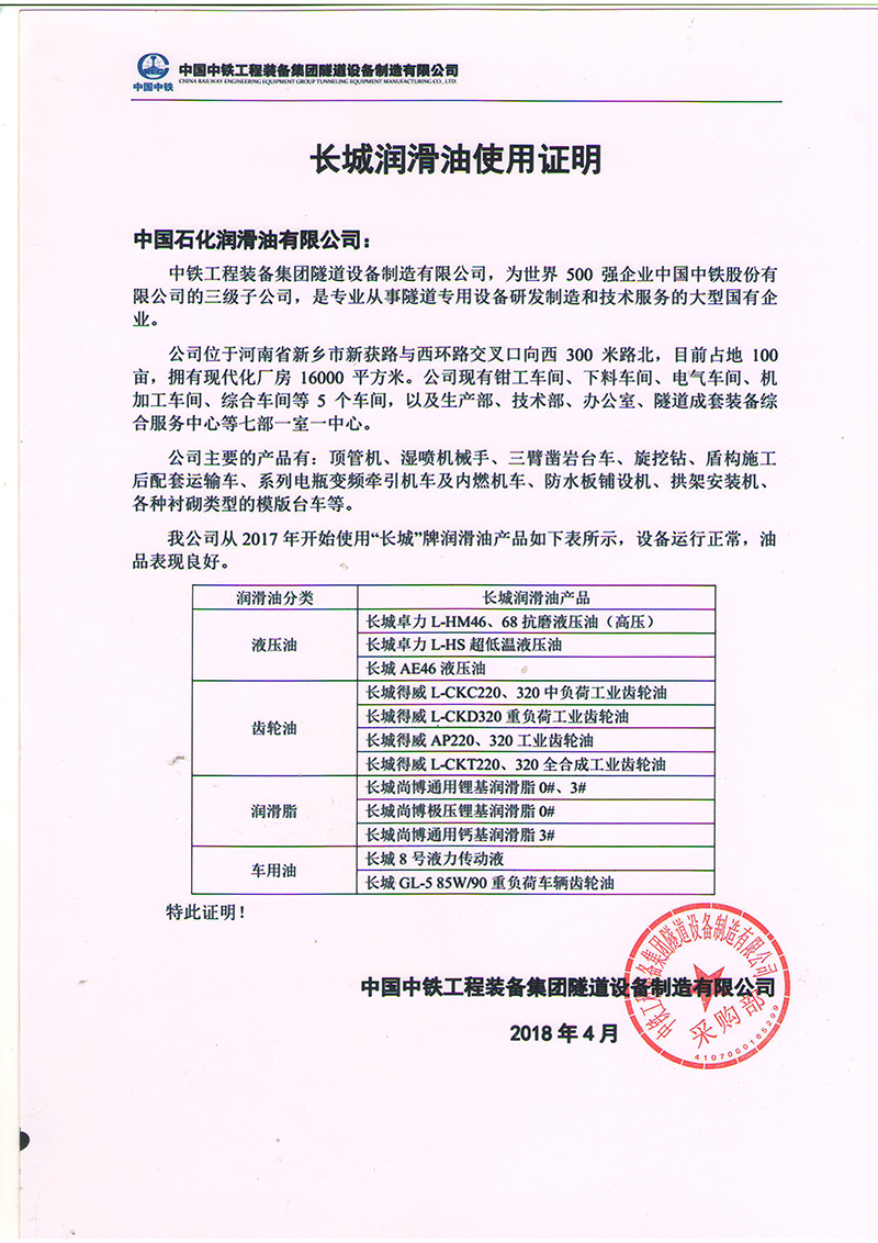 长城润滑油脂获得中国中铁工程装备集团隧道设备制造有限公司使用证明