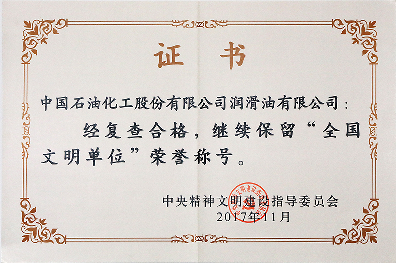 2017年11月全国文明单位复查合格证书