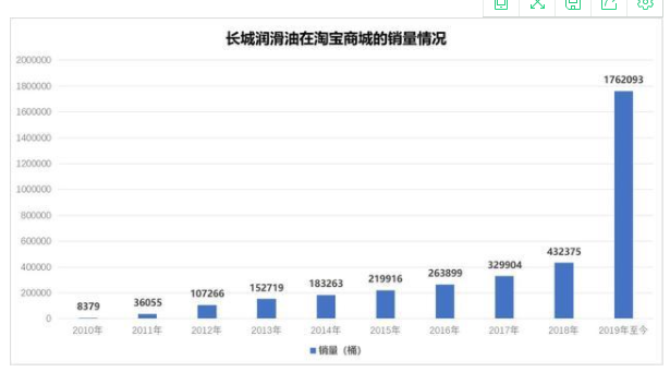看一组数据,2010年长城润滑油正式入驻淘宝商城,那一年全年销量8379桶,2014年,长城润滑油在淘宝商城的全年销量为182363桶,翻了21倍。2018年全年销量为432375桶,翻了41倍,而到2019年,至今已经销售1762093桶,相较于2010年已经翻了210倍。