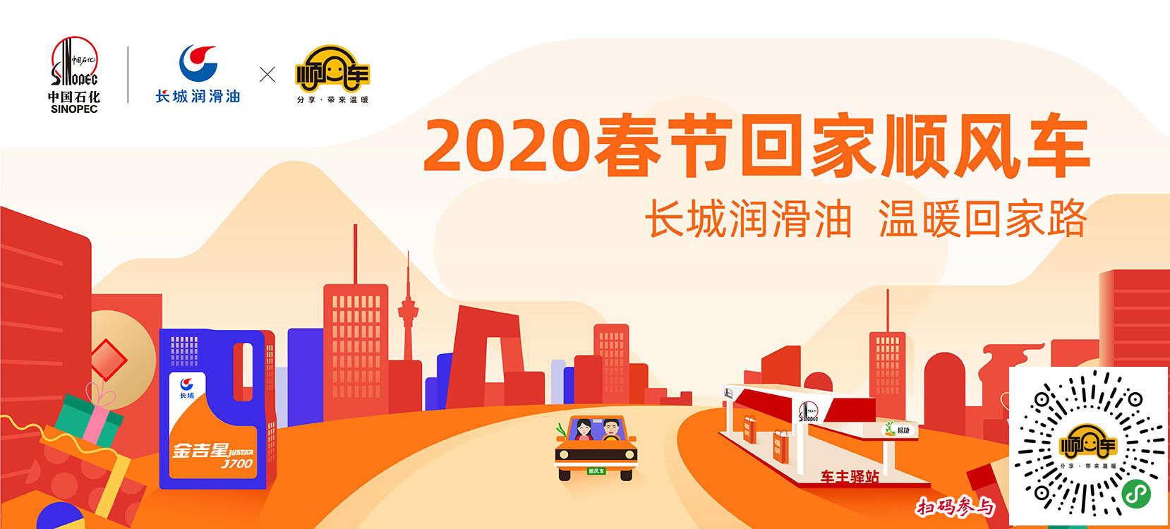 如果你还没买到回家的车票,或者你开车回家还有空座,请加入“长城润滑油-2020春节回家顺风车”,让我们搭上公益顺风车与老乡一起回家过年。本次活动由公益顺风车、北京车友协会联合中国石化长城润滑油共同发起,并得到了中国石化易捷便利店、分众传媒、金嗓子、阳光保险、京东、环球娃娃等爱心企业的支持。