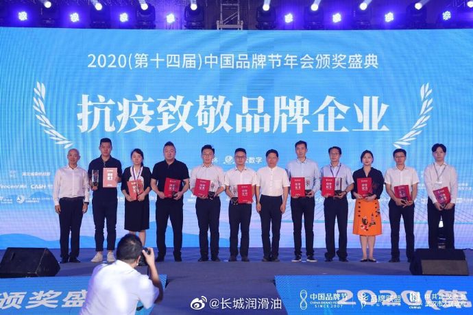 8月8日,在武汉举办的2020(第十四届)中国品牌节年会上,中国石化长城润滑油荣获“2020中国品牌榜500强”、“抗疫致敬品牌企业”两项荣誉。其中“抗疫致敬品牌企业”是本次品牌节年会上特别设立,对疫情期间做出突出表现的优秀品牌进行表彰。