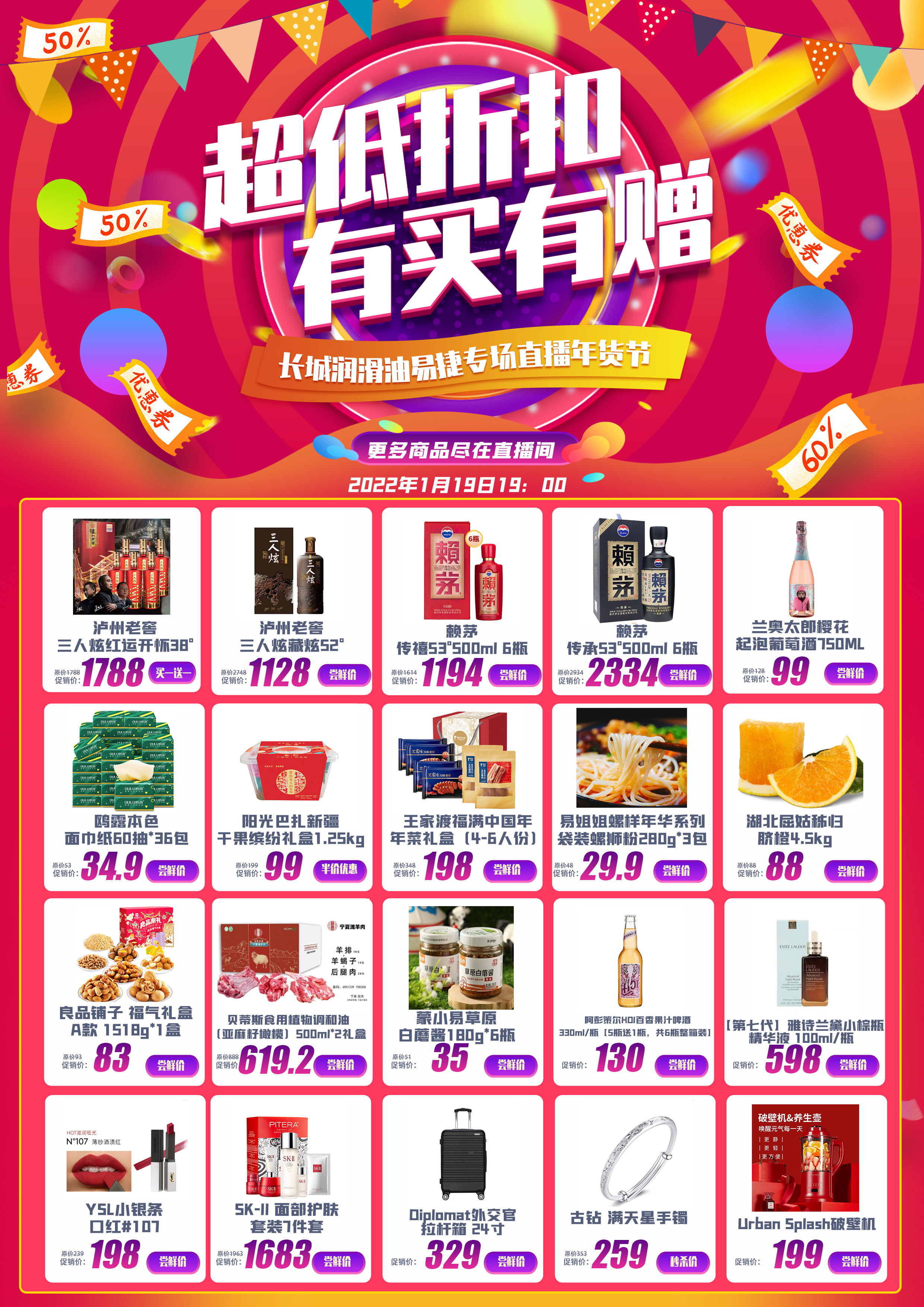 2022年1月19日晚19:00-21:00,加油中石化小程序直播,支持本次直播活动提供年货商品的有广西石油、贵州石油、新疆石油、内蒙古石油、易捷国际以及泸州三人炫等7家供应商。直播活动共开展6轮抽奖,近10轮秒杀,看直播赢限量版冬奥纪念保温杯。
