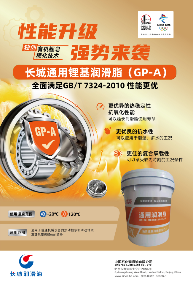 长城通用锂基润滑脂(GP-A)采用中国石化润滑脂研究院独创的有机锂稠化技术,通过在脂肪酸锂皂稠化精制矿物油中加入抗氧、防锈等添加剂炼制而成,可取代钙基、钠基润滑脂,适用于普通机械设备的滚动轴承和滑动轴承及其它摩擦部位的润滑。