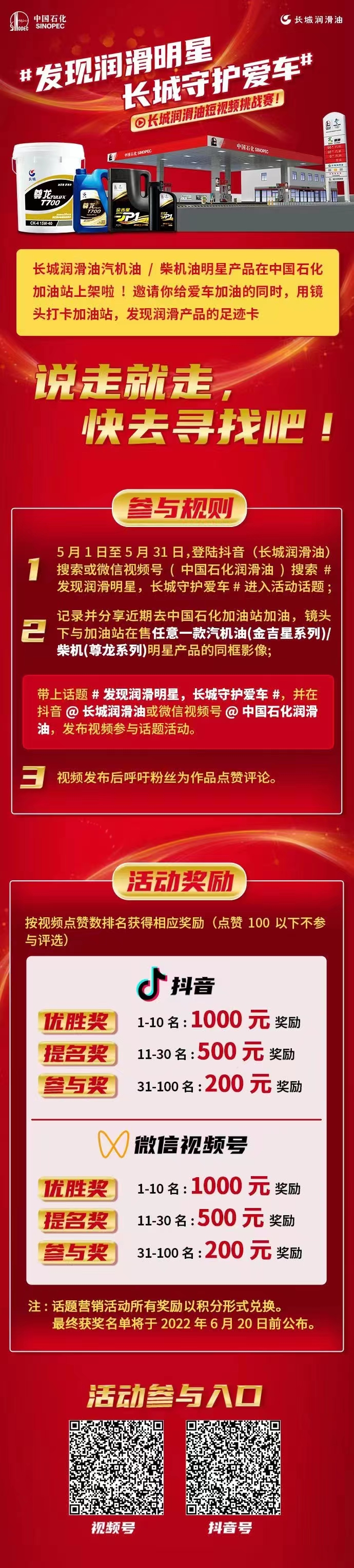 即日起到5月31日,在中国石化加油站拍摄和长城润滑油汽机油、柴机油明星产品同框视频,就可参与比赛,就有机会获得奖励。