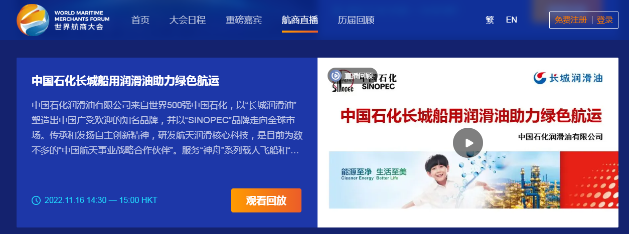 11月15-16日,第二届世界航商大会在香港举行。中国石化润滑油有限公司组队参加大会活动,线上发布题为“中国石化长城船用润滑油助力绿色航运”的主题报告。