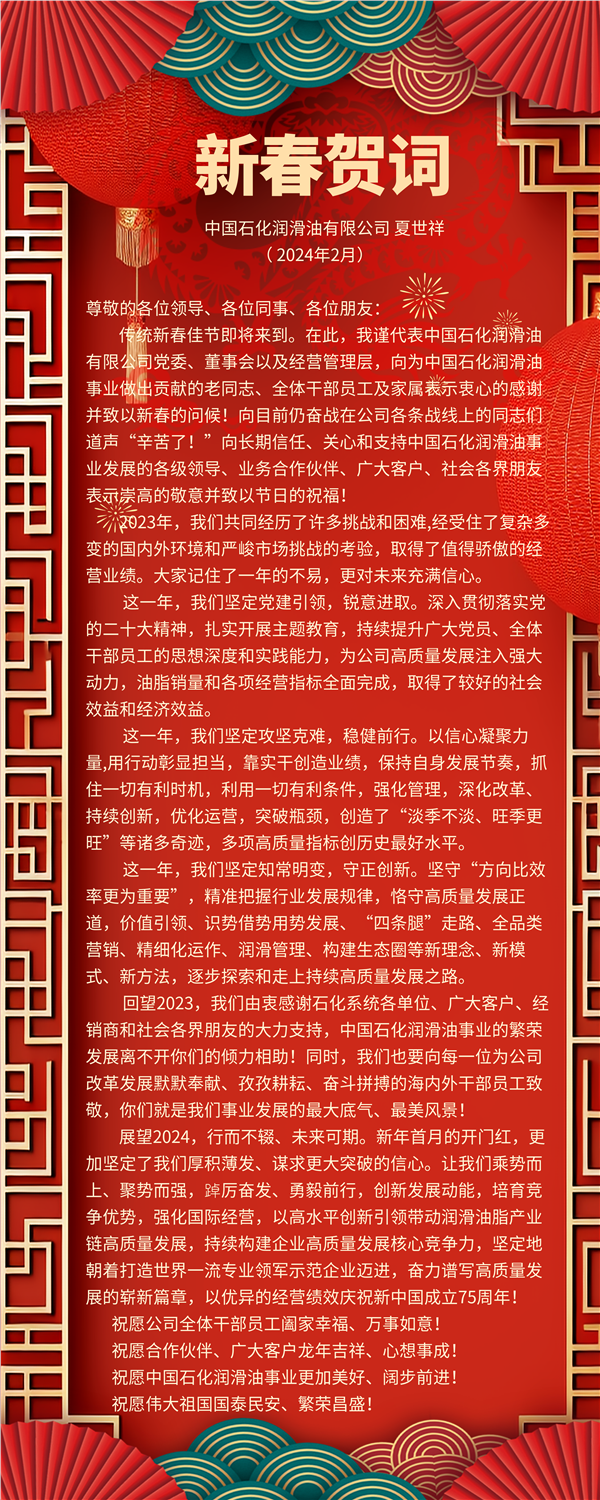 中国石化润滑油有限公司党委书记、董事长夏世祥发布新春贺词