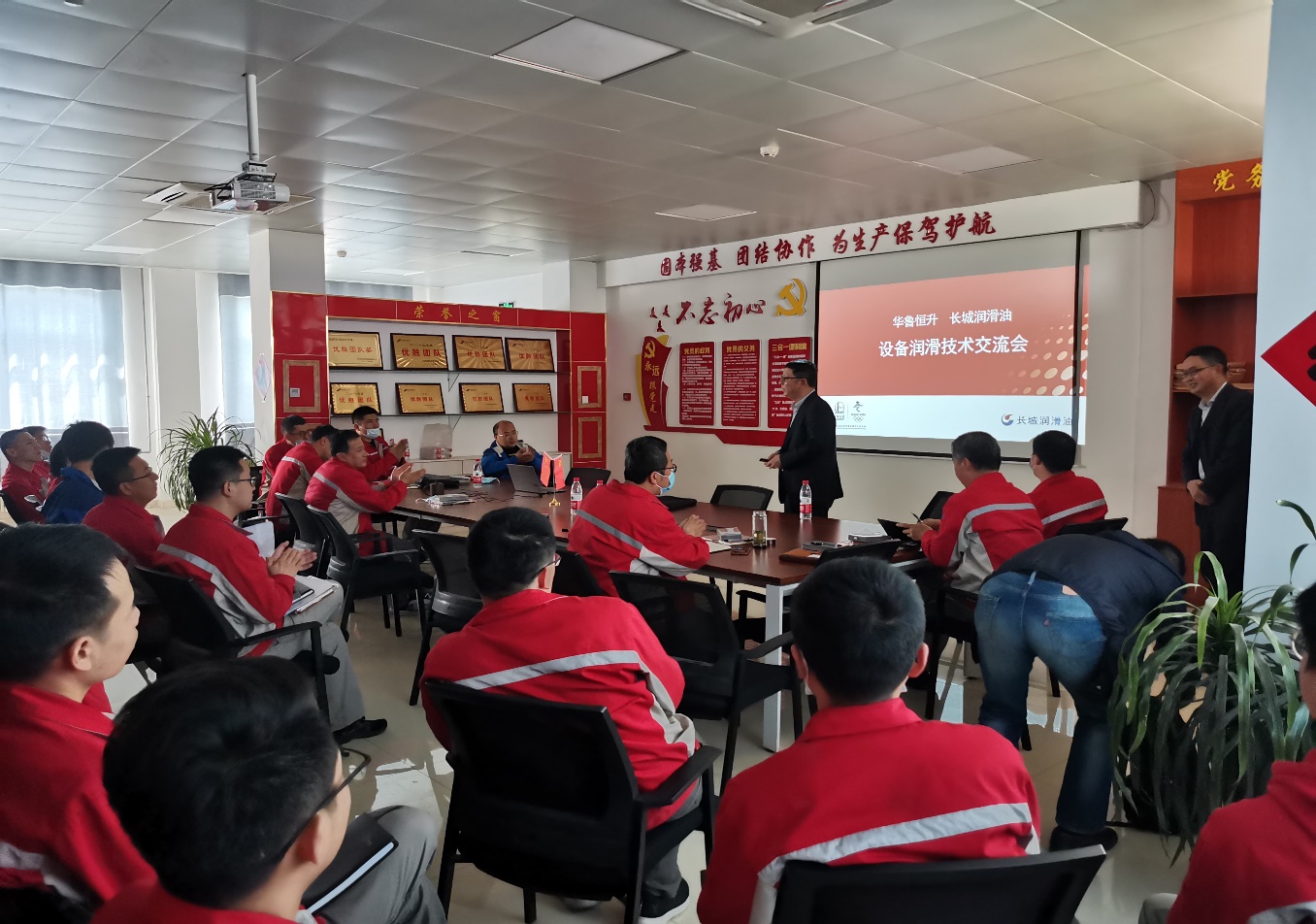 就说2021年4月吧,应山东华鲁恒升化工股份有限公司邀请,中国石化润滑油合成油脂分公司技术总监李光赋与华北区销售总经理辜锡刚和我公司人员一起到山东华鲁恒升进行技术交流,以推动华鲁恒升设备用油的国产化替代和国产的升级换代,华鲁恒升的现场维保人员和设备处管理人员都积极参加;双方就设备润滑油的基础知识与特殊设备用油做了深入的沟通。